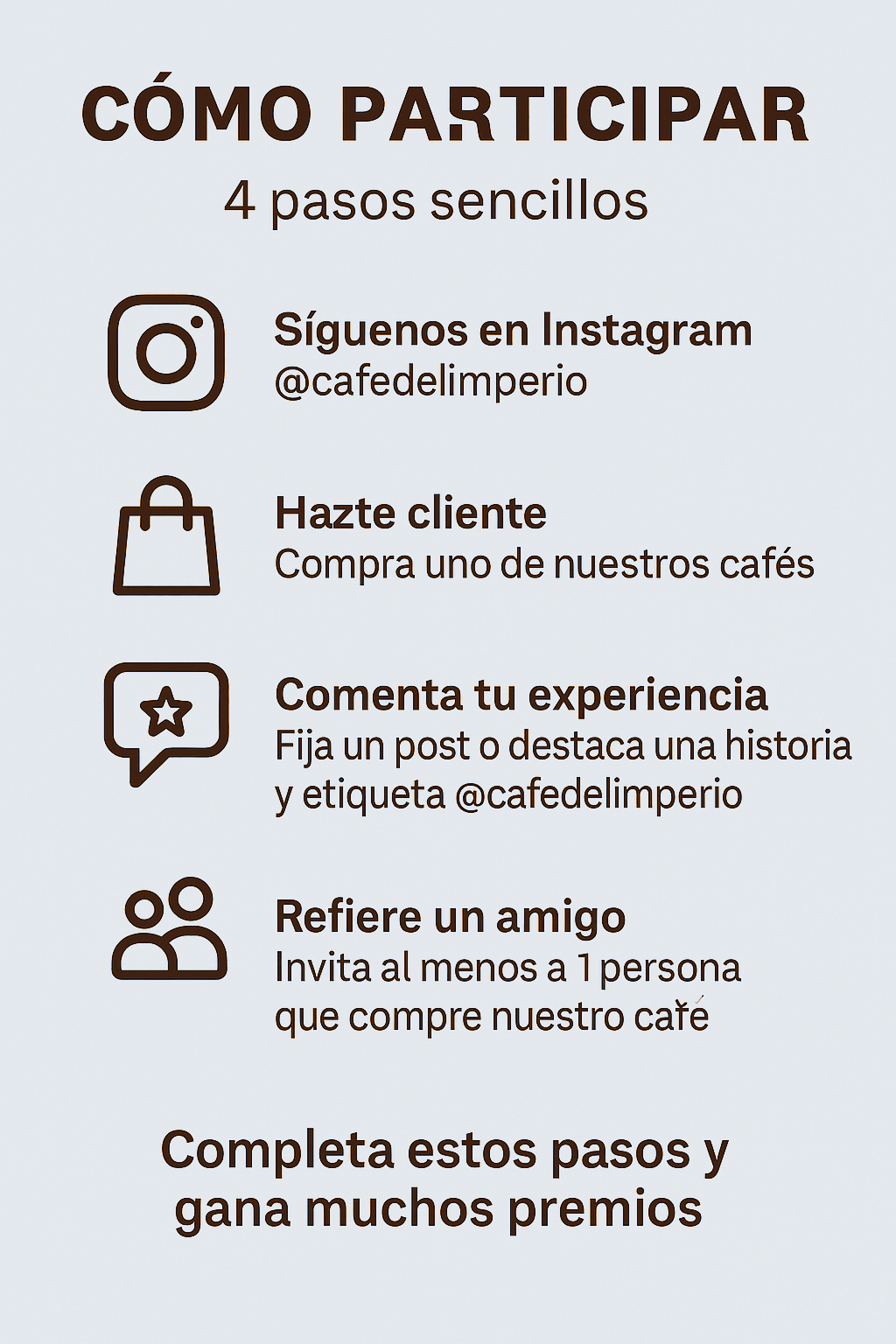 Las opciones de ganar nuestros premios incrementarán según el volumen de compras, actividad en Instagram relacionados con Café del Imperio y de referidos.